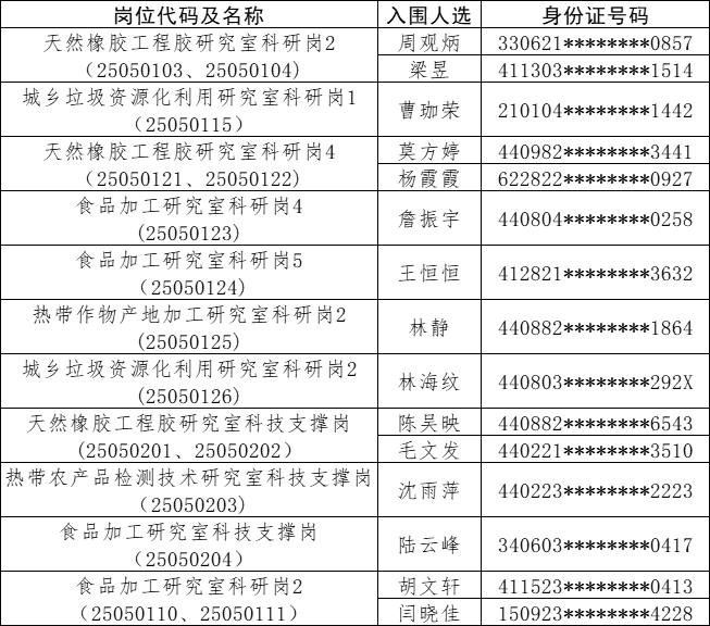 中国热带农业科学院农产品加工研究所2025年度第一批公开招聘工作人员面试已于2025年5月20日结束,具体成绩详见附件。入围体检与考察人员名单公告如下。