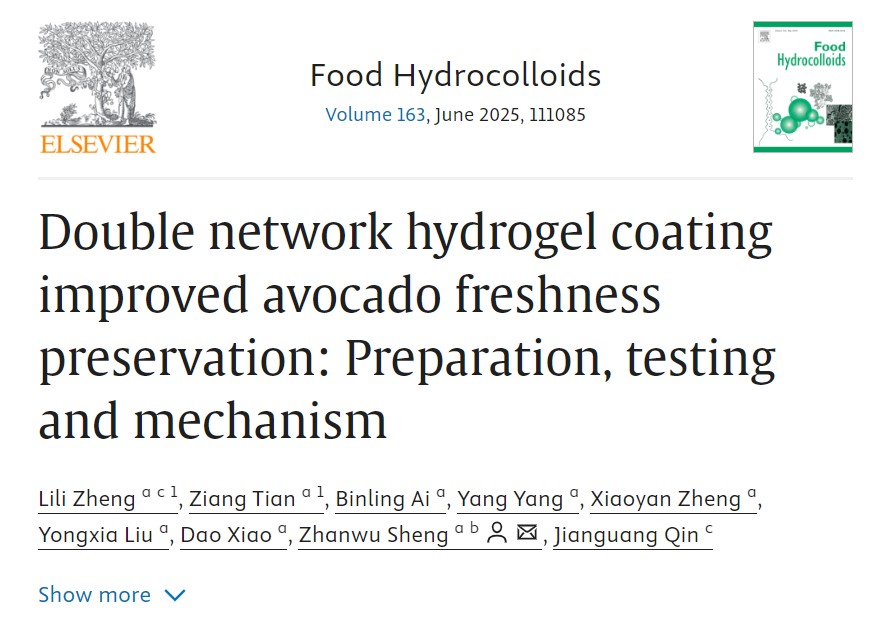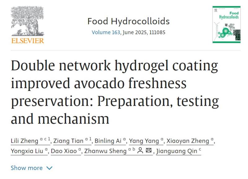 相关研究成果以“Double network hydrogel coating improved avocado freshness preservation: preparation, testing and mechanism”为题发表于《Food Hydrocolloids》。中国热科院生物所郑丽丽副研究员、海南大学联合培养硕士研究生田子昂为共同第一作者,加工所盛占武研究员为该论文通讯作者,澳大利亚Flinders大学Prof. Qin为本研究做出重要指导。该研究得到海南省自然科学基金创新研究团队项目(320CXTD440)、海南省科技人才创新项目(KIRC2023C26)等项目的资助。