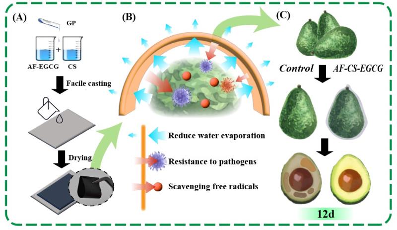 中国热科院加工所首次创建双网络凝胶涂层,在呼吸跃变型水果采后常温保鲜、延长货架期方面取得新进展。以蛋白质、多糖、多酚和天然交联剂等食品级原料为主,通过相变和交联反应在水果表面形成双网络凝胶(double network hydrogen, DN)涂层,实现了牛油果常温保鲜长达12天,同时保持其果实品质。该DN涂层材料具有均匀致密的网络结构、较高的抗氧化性和抑菌效果,有效阻隔水、气和紫外线穿透,防止有害微生物的快速生长和繁殖;同时,DN涂层有效降低果实呼吸和乙烯释放速率,延缓果实后熟、老化和变质,在食品常温保鲜领域具有重要的应用潜力和参考价值。