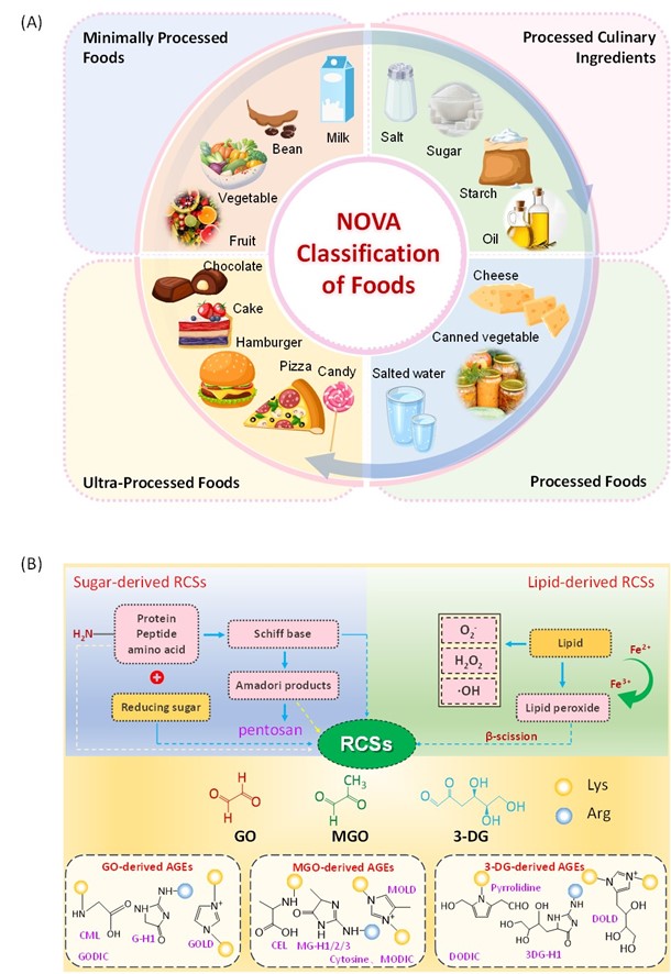 (A) 食品加工的范围,根据NOVA框架及代表性产品定义。箭头表示加工程度的递增。(B) 不同反应性碳基物质(RCS)衍生的晚期糖基化终产物(AGEs)及其形成路径。