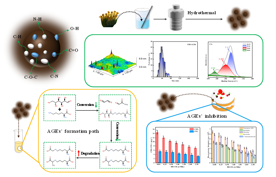 烘焙食品在高温加工过程中,糖类与蛋白质经美拉德反应产生的AGEs,已被证实与糖尿病、肾衰竭等慢性疾病密切相关。传统植物多酚抑制剂因热稳定性差等问题应用受限,而新型纳米材料碳点(CDs)凭借优异的水溶性和热稳定性,展现出独特优势。尽管 CDs 对 AGEs 的抑制作用已确定,但它们对热加工食品中 AGEs 的减控效果仍未得到探索。AGEs 的形成涉及各种中间体,CDs 抑制不同产物形成的机制也尚不清楚。